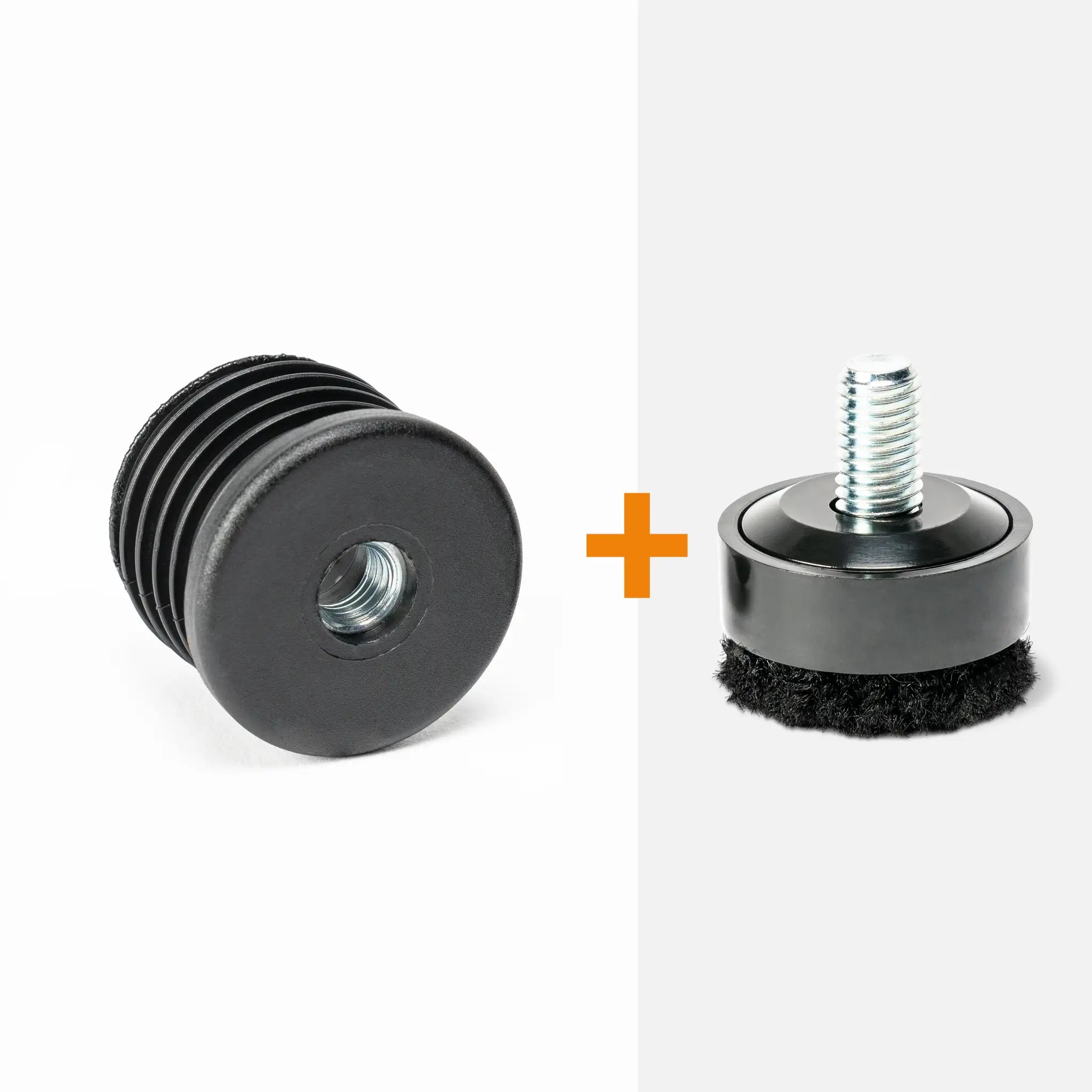 Runder Lamellenstopfen mit eingebautem Innengewinde M10, um runde Stahlrohrbeine mit unseren kratzerfreien Gewindegleitern nachzurüsten.